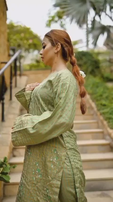 A classic sage green article in stripes design. With a front open look in shirt making its look more fascinating. Comes in a co-ord set style shirt & a trouser in same khaddi silk fabric. Block printing in stripes making the fabric more attractive.